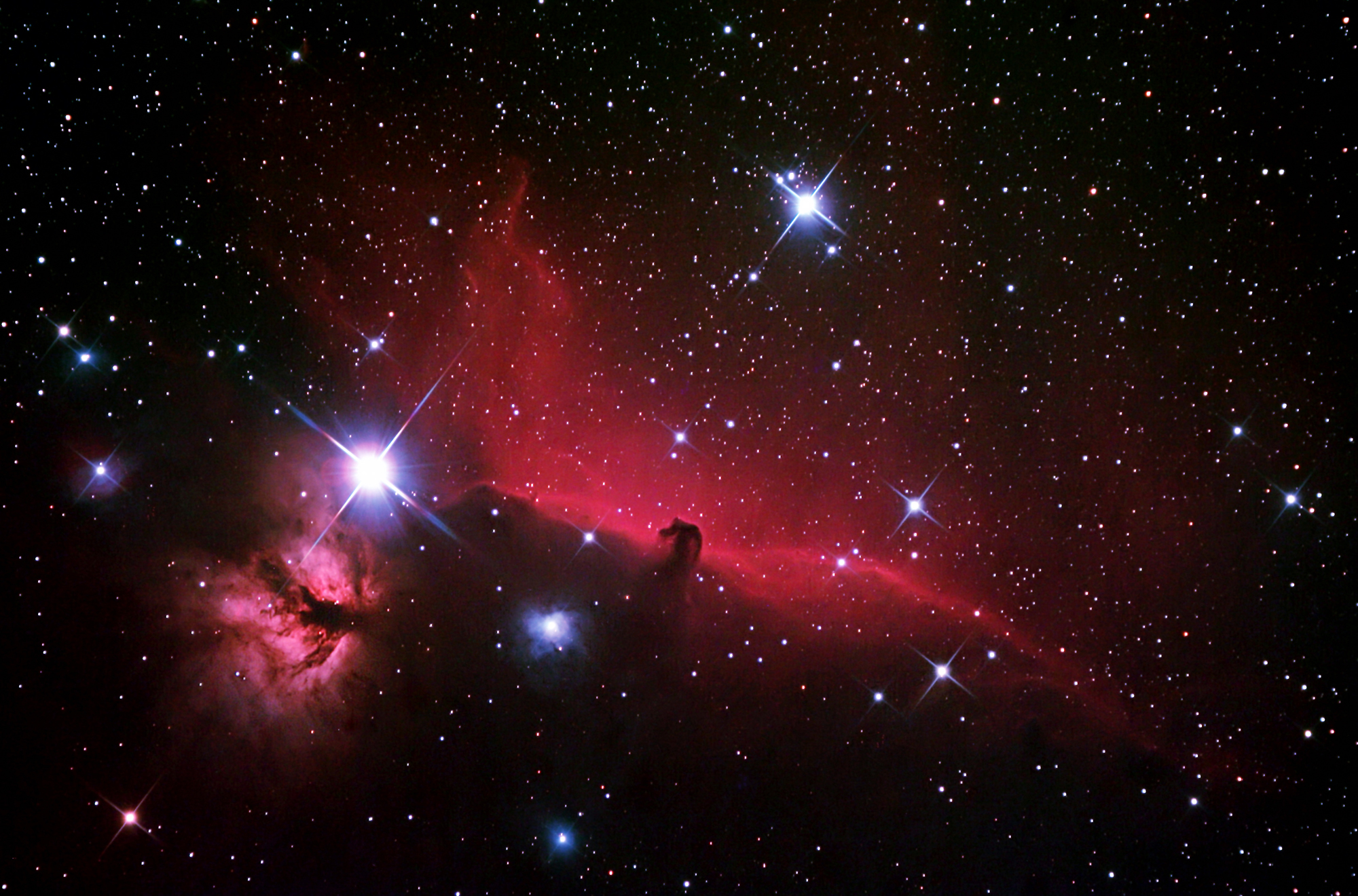 Photo: ../Sky_this_month/photos/Horsehead_nebula_150mm_8x6min.jpgPhoto: ../Sky_this_month/photos/2008-12-07_HORSE_FLAME_STACK_MAS.jpgMoving to the 3 belt stars, first (on the left) is Alnitak, to the left of which is the Flame nebula and stretching below are the gas clouds which include the famous 'Horsehead nebula'. Whilst the Horse-head is relatively small and hard to image, MAS members have still managed to capture it (left, by Alun H. in Hydrogen Alpha) along with the Flame nebula (right).