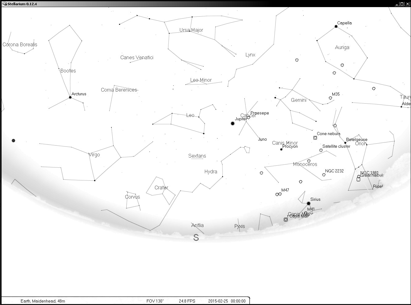 Meteors this month None of note. Photo: ../Sky_this_month/photos/February.jpgThe sky (looking South at midnight) toward the end of the month (click the sky map, right, for a larger view)