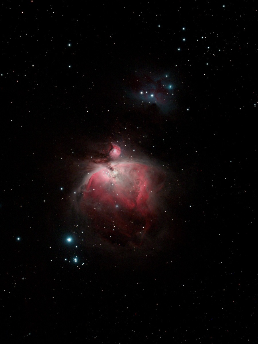 Photo: ../Sky_this_month/photos/M42-hdr.jpgPhoto: ../Sky_this_month/photos/m42_combined_sml.jpgWe then come to Orion's 'sword', the 'line' of stars 'hanging' from the belt - and here we find the M42, the Orion Nebula, which is actually visible to the naked eye (as a fuzzy patch of light) a red emission nebula. This is a really impressive structure and a favorite amongst astro-photographers (see MAS members photos, left and right)